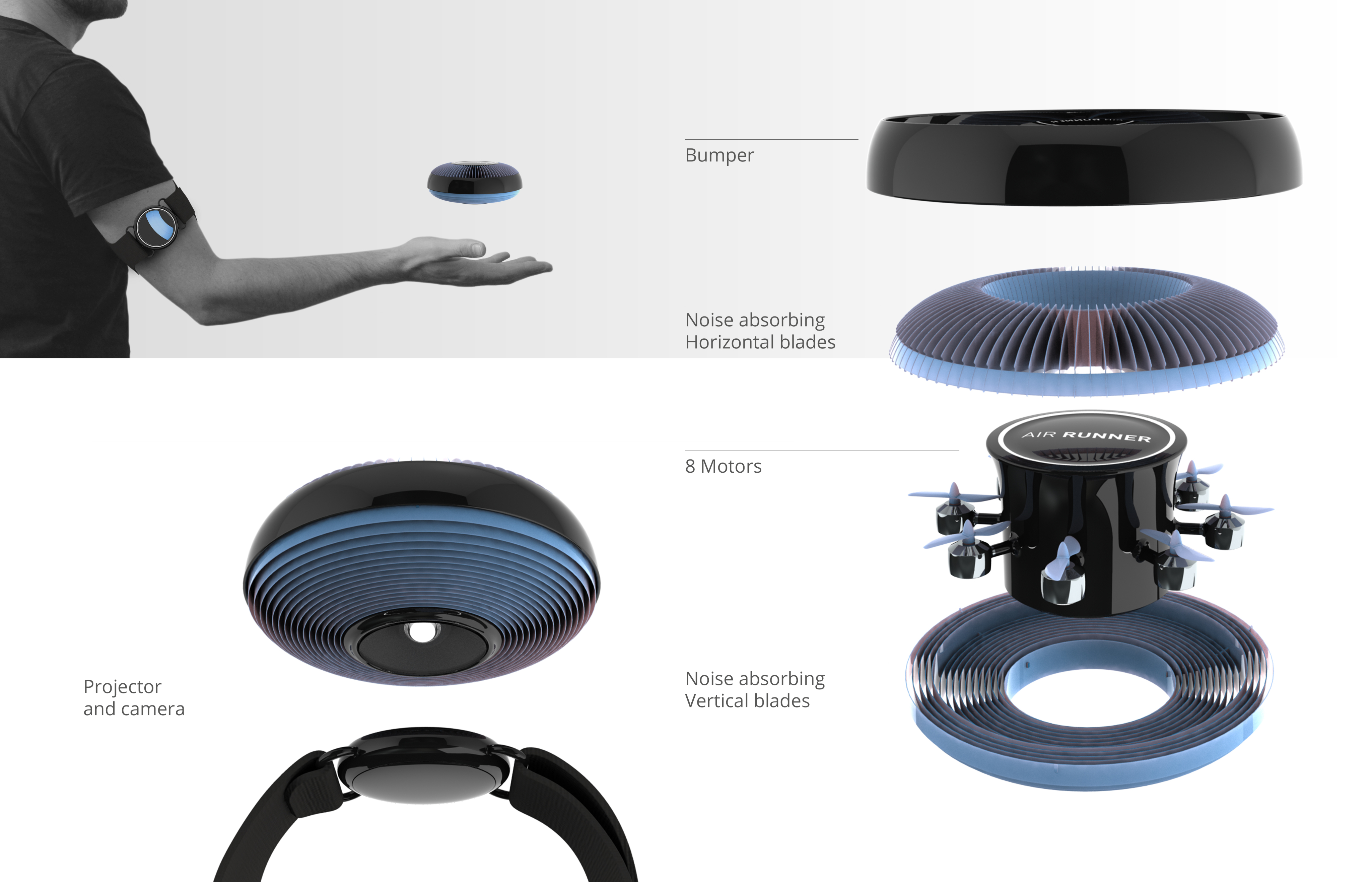 Eight motors steer Air Runner steadily and robustly and avoid sudden crashes due to gusts of wind. While original drones cause pretty some noise, the horizontal and vertical blades of Air Runner absorb sounds as well as shield the wings against external impacts.