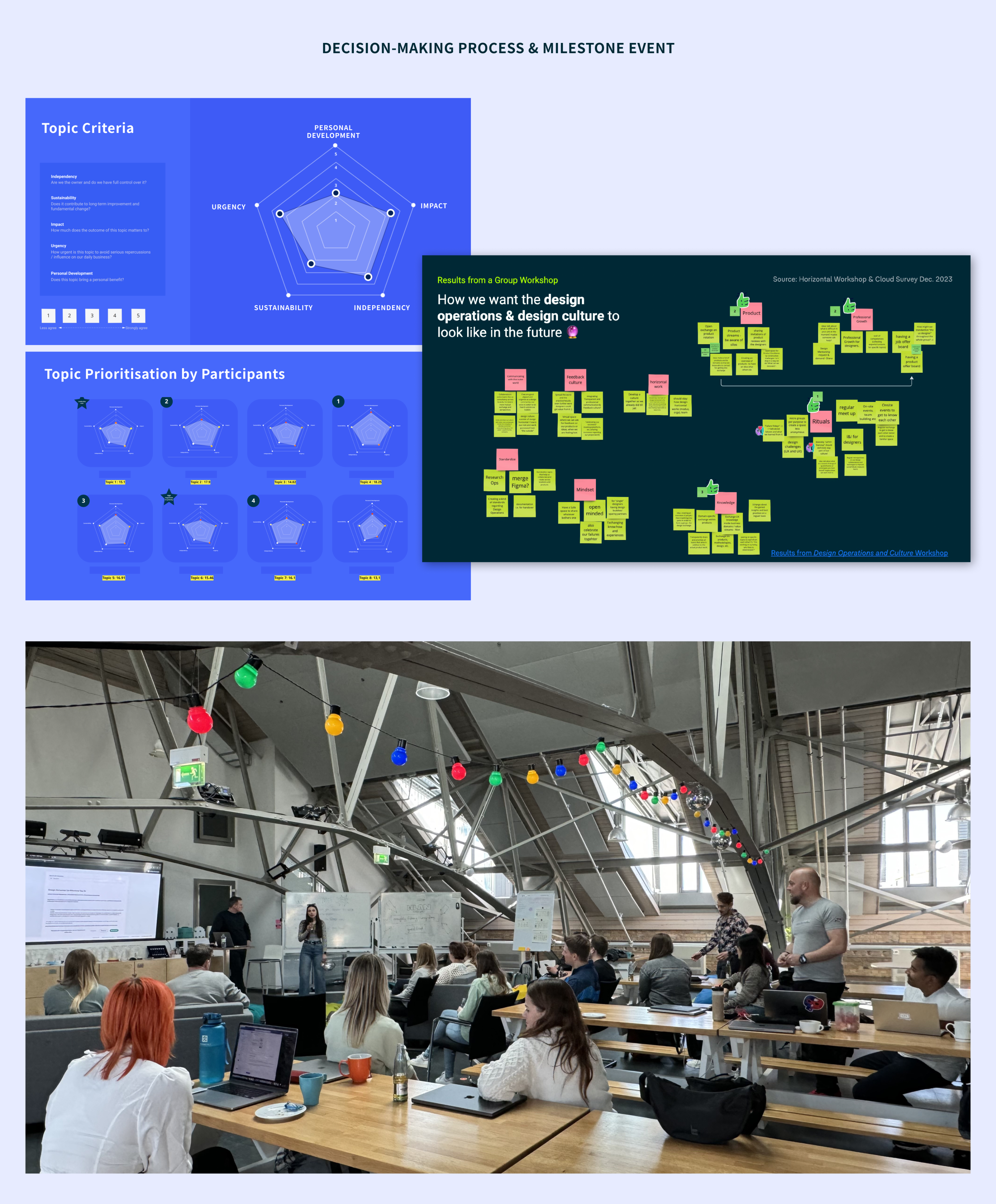 Quarterly “Milestone Days” became our heartbeat. Designers presented progress to a larger audience, online and onsite. Though controversial at first (setting “Deadline”), this became a critical motivator and gave the work real visibility.